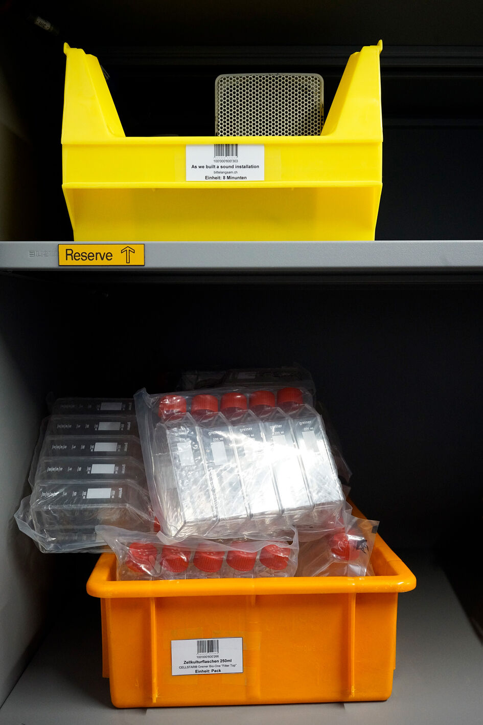 The sounds associated with work processes serve as a starting point for the artistic examination of everyday life in the laboratory. Sound is understood as a material that refers to its place of origin and at the same time offers the possibility to create its own space in other contexts. The sound that can be heard here refers to the studio of the two artists while they created the installation. It’s an art piece that was conceived for the site of their repository, but is not present. Instead, it is reduced to the audible observation of the artistic process in the studio, which attributes its own significance to the sound material. Following the notion of musique concrète, the sound finds its way back into the laboratory building and joins the components of the repository.
